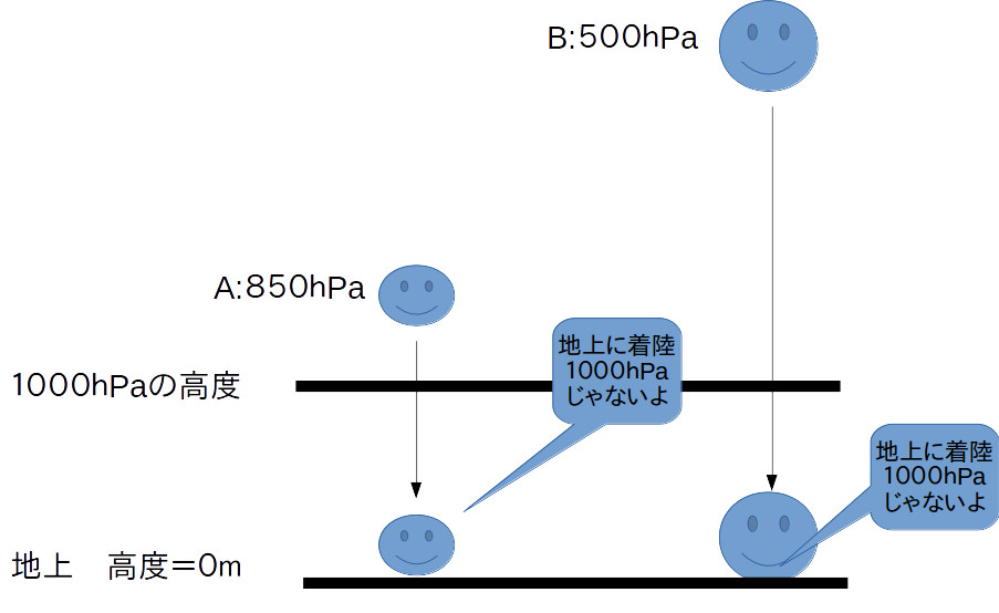 850hPaの空気塊Aは1000hPaにしても、現実の1000hPaの高さと違います